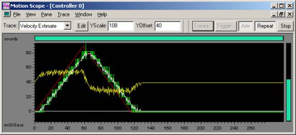 Notice that we are seeing the beginning of a peak in the velocity error. The ringing in the velocity error is indicitive of a phase problem. There are two main sources of this phase lag. Ka1 is too high. The phase lag in Ka1 gets worse as Ka1 is raised. The system (servo motor, drive, mechanics, etc.) have too much phase lag. In this instance, we know it is Ka1, as we didn't have this problem until we turned up Ka1. At this point, turn down Kpv1 by 2/3. The amount you turn down Kpv is up to you, but 2/3 is a good starting point. You may also want to turn down Ka1 a bit (~10-20%) if you want more stability margin. Here is the result of turning down Kvp by 2/3.