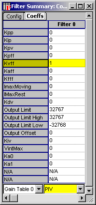 Command a test move. If you see no movement during the move, turn up Kpv x10 or so. In the screenshot below, there is no movement when Kpv = 1. NOTE: When tuning the velocity loop, Kvff will normally not be adjusted from 1. This is because the PIV loop knows the actual and commanded velocities of the stage. No adjustment is needed in normal systems.