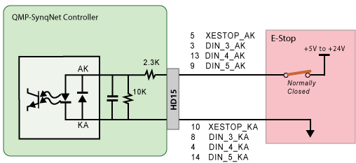 System E-Stop Input and Digital Inputs 3-5To Pull-up LogicThe E-Stop Input and Digital Inputs 3-5 (DIN) have the same pull-up logic. There are 3 Controller I/O digital inputs. Unlike the XMP-SynqNet controllers, the QMP-SynqNet controllers have dedicated I/O. T015-0001: HD15 Connector Pinouts