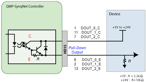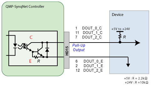 There are 3 Controller I/O digital outputs. Unlike the XMP-SynqNet controllers, the QMP-SynqNet controllers have dedicated I/O. Pull-Up Output Logic T015-0001: HD15 Connector Pinouts |