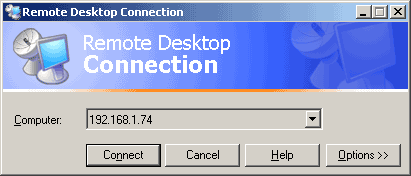 Host-side Remote Desktop ConnectionTo connect to an eXMP running Windows XP Embedded from a host PC, use Microsoft’s “Remote Desktop Connection” application, which comes with Windows XP. If you are not using Windows XP, then you will need to download the Remote Desktop Connection software from Microsoft (click here) and install it on your host PC. Run the Remote Desktop Connection program (Programs > Accessories > Communications). Enter the computer name or IP address for the eXMP (default = 192.168.1.74) and select Connect: