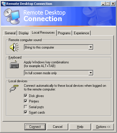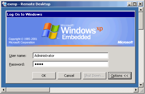 After a few seconds, the Host will connect to the eXMP (Target) and the Remote Desktop will show the Windows XP desktop on the eXMP. You will need to login: User Name: Administrator From the Remote Desktop, you can operate the eXMP. The desktop is similar to a normal Windows XP workstation. In general, you will be able to run any Windows application on the eXMP. Applications and performance may be limited by the available compact flash memory space, memory, CPU speed, and network connection. The Remote Desktop Connection has several Options that can be configured to optimize the feature set and performance. For example, the login can be automated under the General tab. Selecting the "Disk drives" option (Local Resources > Local devices) will allow the eXMP to access the Host’s disk drives. This feature is very useful for transferring files between the Host PC and the eXMP.
