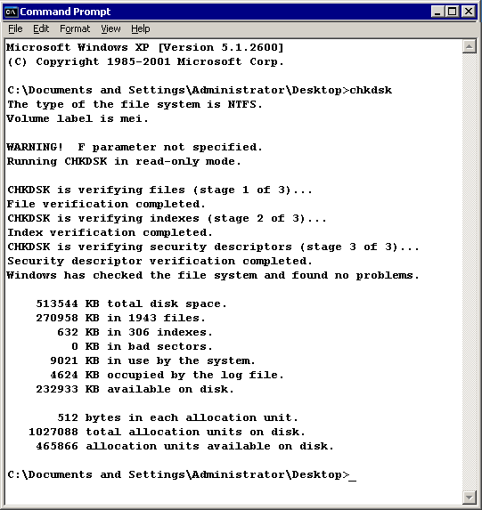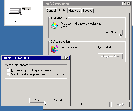 Checking Disk for Errors with WinXP EmbeddedThe XP embedded image Rev 1.2 (and higher) supports automatic chkdsk for C:\ drive (Compact Flash) at boot time. If there are any errors, chkdsk will automatically correct the corruptions and re-boot the eXMP-SynqNet. If there are errors, the chkdsk will typically require 10~30 seconds to correct them and log the results to C:\bootex.log. TIP: If you suspect file integrity problems, check C:\ for a bootex.log. If there is no bootex.log, then XP did not find any disk errors. If there is a bootex.log, then errors were found. The log will contain the output from each instance of chkdsk's execution. If there are multiple entries in the bootex.log then the eXMP is not being properly shutdown. You can manually check the disk integrity by right clicking on the C:\ and selecting Properties > Tools > Check Now...