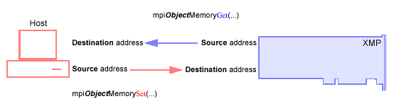 The Get method's destination address points to host memory, while the source address points to motion controller memory (based on the address returned by the Memory method for the object). The Set method is the opposite. The Set method's destination address points to motion controller memory and the source address points to host memory.
