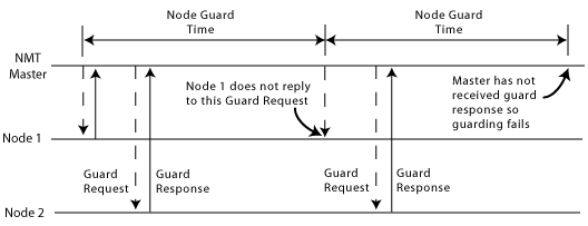 It is mandatory for a node to either support the node guarding or heart beating protocols, or to support both. The heartbeat protocol has recently been introduced to CANOpen (in June 1999), and will probably NOT be supported on many nodes, but its adoption is recommended for all new nodes. The XMP's implementation will operate with either protocol and will automatically detect the protocol that each node supports and then use the most appropriate protocol for the CAN network. The healthType field of the MEICanNodeInfo structure reports the health checking protocol being used with each node. The Node Guarding protocol has the master sending an RTR message to all nodes on the network and checks to see whether a response is received from each of the nodes.