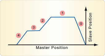 For each segment you need to define the distance that the master will move during the segment and the position that the slave will achieve at the end of the segment. This cam profile will be represented by the following cam table.