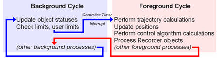 The foreground cycle processes crucial information that needs to be updated every servo cycle. The background cycle processes all other information. The background cycle runs continuously on the controller as often as it can. A foreground cycle starts when a timer interrupt on the controller puts the background cycle on hold. After the foreground cycle is done, the background cycle continues to run. The foreground cycle will be started at regular intervals at the rate of once per servo cycle. The background cycle runs as quickly as possible with whatever spare time the foreground cycle does not use.