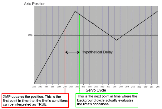 Usually the background cycle will complete many cycles in the time it takes to complete a servo cycle. However, the time it takes to complete a single background cycle can end up spanning many servo cycles if the sample rate is raised or if the foreground cycle takes more time to process. If an application requires a high number of controller objects and features or a fast sample rate, it is possible that background cycles could take multiple servo cycles to process, even dozens if the controller is pushed to its limits. Since user limits are evaluated in the background cycle, events might not be generated or output might not be written in the same servo cycle as when the conditions for the user limit would otherwise first be evaluated as True. In the example below, a user limit is set up to evaluate True when the axis position is greater than 1000. We would expect the conditions of the user limit to evaluate True for sample of 240. The controller’s background cycle, however, does not evaluate the user limit until sample reaches 242. Therefore, an event is triggered two samples later than one would hope. The delay of two samples shown here is not indicative of typical controller setups. Background cycles are commonly evaluated more quickly than foreground cycles, but as explained above, it is possible for the foreground cycle to process more frequently.