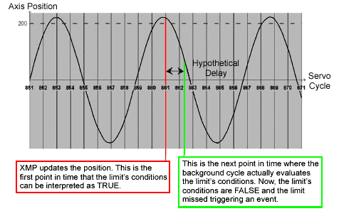 The following example shows how it is possible to even miss a user limit when the conditions that would cause the user limit to evaluate as True and change too quickly back to False. In this example, a user limit has been set up to evaluate True when the axis position is greater than 200. The axis is performing sinusoidal motion of amplitude 220 encoder counts with an approximate period of eight samples. If the background cycle delays evaluating the user limit by even one servo cycle, it will miss triggering an event.