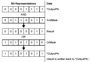 NOTE: If it is important that user limits are evaluated every servo cycle, then the background cycle “maximum delta” must not exceed a value of 1. The maximum delta value can be checked on the Controller object’s “Stats” tab in Motion Console. More information can be found in the overview of SynqNet Controller Performance. Custom Trigger ConditionsConditionSrcAddress – the controller memory location to use as the source for the condition block’s comparision. Use VM3 or the Map object functions to obtain memory location string of interest. NOTE: VM3-strings are not guaranteed to be forward compatible with future versions of the MPX. ConditionIs64Bit – determines if the comparison taking place is a 64-bit integer comparison. ConditionIsSingle – determines if the comparison taking place is a single precision floating-point comparison. ConditionValue – the value to which the controller memory location is compared against. ConditionLogic – determines the type of comparison used. For example, to test if the source memory location is greater than a particular value, set ConditionLogic to Mpx.UserLimitLogic.Gt. ConditionMask – determines which bits are used in the source memory location for the comparison. This is used only when ConditionIs64Bit is False and ConditionIsSingle is False. Custom Output Specification OutputAddress – the controller memory location where the output will be written. Use VM3 or the Map object functions to obtain memory location string of interest. NOTE: VM3-strings are not guaranteed to be forward compatible with future versions of the MPX. OutputNewValueSingle – The new single precision floating-point value to be written when a user limit’s trigger is fired. This is used only when OutputIsSingle is True. OutputAndMask – a bit mask that will be bit-wise AND-ed with the data pointed to by OutputPtr. This is used only when OutputIsSingle is False. OutputOrMask – a bit mask that will be bit-wise OR-ed with the result of (AndMask bit-wise-AND (value at OutputOrMask) ). This is used only when OutputIsSingle is False. Here is an example showing what happens for each combination of bits for OutputAddress, OutputAndMask, and OutputOrMask: