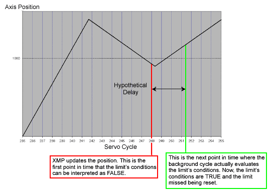 Usually the background cycle will complete many cycles in the time it takes to complete a servo cycle. However, the time it takes to complete a single background cycle can end up spanning many servo cycles if the sample rate is raised or if the foreground cycle takes more time to process. If an application requires a high number of controller objects and features or a fast sample rate, it is possible that background cycles could take multiple servo cycles to process, even dozens if the controller is pushed to its limits. Since user limits are evaluated in the background cycle, events might not be generated or output might not be written in the same servo cycle as when the conditions for the user limit would otherwise first be evaluated as True. In the example below, a user limit is set up to evaluate True when the axis position is greater than 1000. We would expect the conditions of the user limit to evaluate True for sample of 240. The controller’s background cycle, however, does not evaluate the user limit until sample reaches 242. Therefore, an event is triggered two samples later than one would hope. The delay of two samples shown here is not indicative of typical controller setups. Background cycles are commonly evaluated more quickly than foreground cycles, but as explained above, it is possible for the foreground cycle to process more frequently.