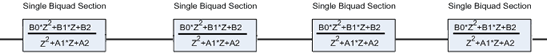Multistage Biquad Example A biquad filter is a second order computational element. The biquad section can be defined by specifying 5 coefficents B0, B1, B2, A1, A2, taken directly from the z-domain transfer function of the biquad. Cascaded Biquad Filters are specified by defining the the 5 coefficents for each of the sections.