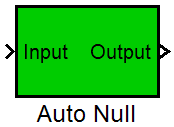 The Auto Null block is ideal for situations when using an analog device as an input. Analog Input devices’ zero state often drifts with some unknown DC Offset. The Auto Null block compensates for this by using a slow integrator to close the drift gap.