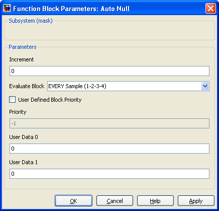 The Auto Null block acts as a slow integrator with a constant magnitude derivative. At each sample, if the input is strictly greater than zero, the output is incremented by the configured increment value, and conversely if the input is strictly less than zero, the output is decremented by it. The output is not modified on samples were its input value is 0.0. This behavior is commonly used to adjust outputs to zero in a feedback situation. The increment will happen at the update rate, determined by the Evaluate Block.