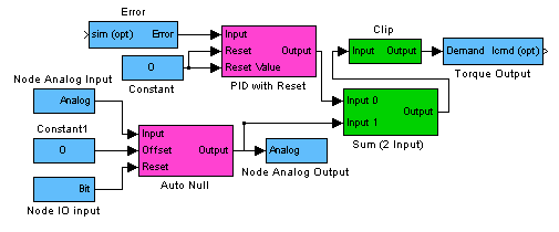 The following example illustrates a simple PID Control loop with a Clip to protect the motor from over current. Additionally with an analog input (another feedback source such as an Accelerometer) sent into an AutoNull block and summed into the control loop.