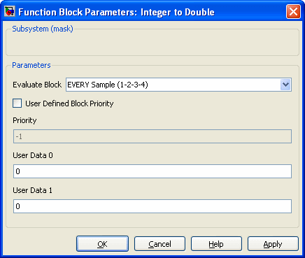 Integer to Double: Input is 32-bit integer value, output is double precision (64-bit) floating point value. The block has two user data fields (User Data 0, User Data 1) to store application-specific data for convenient storage and retrieval. See User Data Storage for details. The block's update schedule is determined by the Evaluate Block. The following Parameter Dialog Box can be opened by double-clicking on the block in a Simulink Model:
