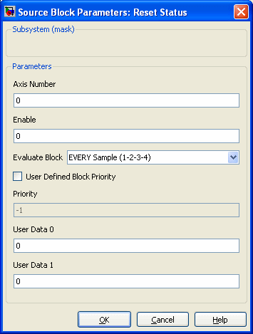 The Reset Status block is an Input block that is commonly used to reset the sum of PID, PIV, and Integrator with Reset blocks. If Enable is zero, then the output is always 0.0. If Enable has a non-zero value, then the output is 1.0 if the Axis has its DISABLED bit set and 0.0 otherwise. Its value is updated as determined by the Evaluate Block.