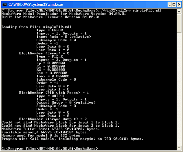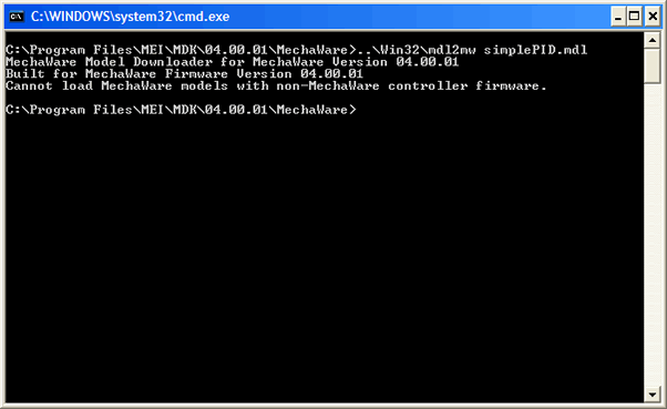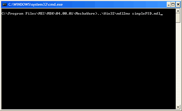 To load the model, open a Command Prompt and navigate to the folder that contains the saved model simplePID.mdl. Note: The default location is C:\Program Files\MEI\MDK\04.00.01\MechaWare.