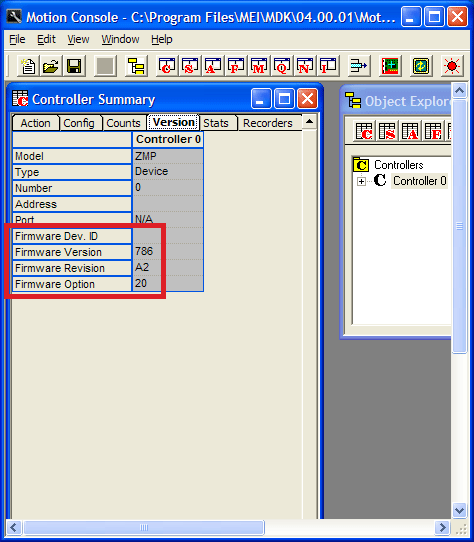 - In Motion Console, open the Controller Summary window to verify the MechaWare Firmware is loaded.