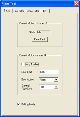 Simple Motor SetupThe setup tab in the filter tool allows simple configuration and management of the motor under test. It can do simple things, such as turning on the servos needed when testing. Without the setup tab, separate programs are needed to do these functions. Current Motion Number – This value indicates the MPI Motion Supervisor number used to abort motion and monitor motion state. This value always matches the current primary motor number selected on the main Bode dialog. Current Motor Number – This value indicates the MPI Motor and Filter number used to modify amp, error, algorithm, and filter coefficients (via PID/PIV/Algorithm/Post Filter tabs). This value always matches the current primary motor number selected on the main Bode dialog. Axis State - Shows the state of the motor as would be seen in Motion Console. This is commonly used to see that the motor is in an error state or idle state. Clear Fault - Click this button to attempt clear an axis state. Amp Enable - Shows whether the motor is enabled or not. Click the check box to toggle the amp enable status. Error Limit - Sets the error limit trigger. This is the maximum counts of following error that are allowed before the error limit action is taken. Error Action - The action taken when the Error Limit is triggered. Control Algorithm - This is the control algorithm type (PID, PIV, etc.) Polling Mode - If this is checked, the Setup tab is continually checking the status of all the values on the Setup tab. If an error is returned from the controller or communication with the controller is broken, this box becomes unchecked and the values are no longer updated. You can recheck this box if you remove the cause of the problem.