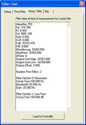 Measured Filter TabThe Measured Filter tab shows the tuning parameters used at the time the currently specified Frequency Response file's measurement was taken. If desired, you can press the Load to Controller button to load these parameters to the controller again. There are a few common uses for this tab: