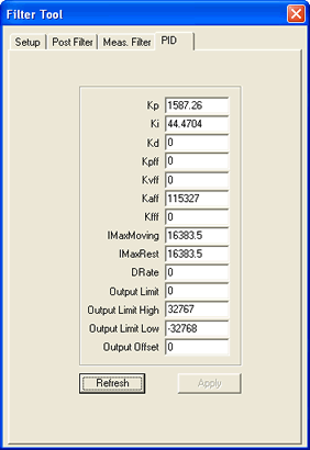 Viewing and Editing CoefficientsThe Filter Tool does not constantly poll the controller to determine if any coefficients have changed. If you change any filter coefficients in another program, click the Refresh button to make the Filter Tool read the latest coefficients. Coefficients changed in the Filter Tool will not take effect until the Apply button is clicked. When either the Apply or Refresh buttons are clicked, the Bode Plot window updates it's simulation The coefficients are always written to and read from the filter number specified in the First Motor Number on the main Bode Tool page. An example for standard firmware is show below where the First Motor Number is 0.