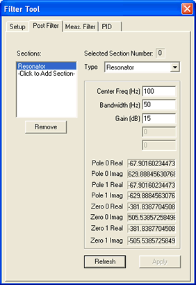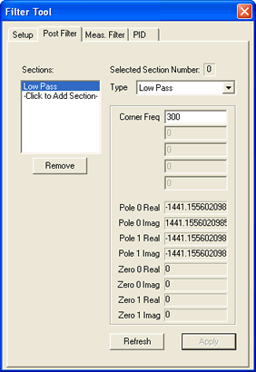 To ensure the most current PID parameters from the controller, click the Refresh button on the Filter Tool. When you click the Refresh button, the Filter Tool retrieves the current filter coefficients from the controller. If the coefficients have changed since the Filter Tool last read them, the coefficients are updated on the screen. To change the current PID coefficients on the controller, edit one of the coefficients in the PID tab of the Filter Tool. When you are done making your changes, click the Apply button to load your changed filter coefficients to the controller. The coefficients are not changed on the controller until you click the Apply button. If the coefficients have changed since the Filter Tool last read them, the coefficients are updated on the screen. Viewing and Editing Biquad Post Filter ElementsThe Filter Tool is an easy way to view and edit biquad post filter elements on the controller. Select the Post Filter tab in the filter tool. IMPORTANT! biquad block sections cannot by added or removed by the filter tool. Instead, disable sections by setting their type to Unity Gain.
