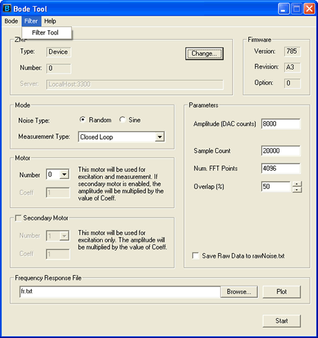Filter Tool - Standard FirmwareOverviewThe Filter Tool window allows the user to modify the Filter Tuning parameters and immediately view changes in filter simulation plots. The Filter Tool is displayed as a separate window that is accessed while using any feature of the Bode Tool. This section describes how to view and change filter parameters for Standard Firmware, including PID, PIV, and all Post Filters. Note: As shown below, if the Bode Tool window indicates Bode Tool, this is for Standard Firmware. If the Bode Tool window indicates Bode Tool (MechaWare), this is for MechaWare Firmware. For more information about viewing and changing filter parameters for MechaWare Firmware, see Filter Tool - MechaWare FirmWare.