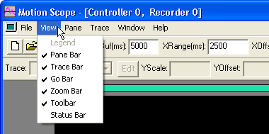 View menu items permit you to alter the layout of the Motion Scope panel by enabling/disabling various toolbars and menus. Refer to the diagram below for the location of each View menu item.