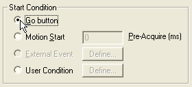 The Pre-Condition defines the Motion Supervisor state that must occur before the Motion Start trigger condition can be triggered. Wait for Motion Done – Motion Start trigger cannot be activated until the Motion Supervisor transitions from the Idle state to the Moving state. None – Motion Start trigger can be activated whenever the Motion Supervisor is in the Moving state. The wait for "at rest" pre-condition is useful when the trigger Repeat is enabled and the motion is continually commanded back and forth between two points. In this situation, the wait for "at rest" will guarantee that the data is acquired at the start of the move, instead of sometime during the middle of the motion. Start ConditionThe Start Condition defines the triggering event to start data acquisition. Possible sources for triggers include the Go button, a Motion Start, or a User definable condition.