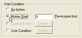 External Event – (Not yet implemented.) Pre-Acquire (ms) – [Usable only when Motion Start enabled.] Amount of data to include with plot before triggered data.1 User Condition – Data acquisition begins when the user-defined trigger conditions are met. To configure the conditions, click the Define button.