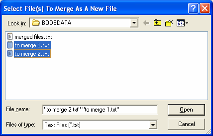 The files are then merged. To see the merged file, open it as you would open any other file. A short example of how the merged files are displayed is shown below. First file to merge (to merge 1.txt)