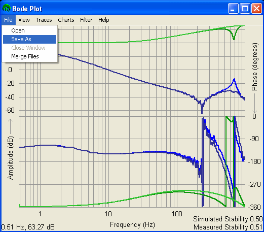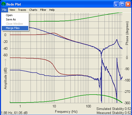 Merge FilesMerge Files is a feature that can take more than one bode plot file and merge them, so you can see all of the merged files at once. There are two common uses for this feature: