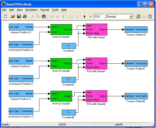 The BasicPIDforBode model includes three PID with Reset blocks connected to three Demand blocks.  The Demand block connects the Filter output to the appropriate Motor. The text under each Block is used to identify the block in Bode Tool.