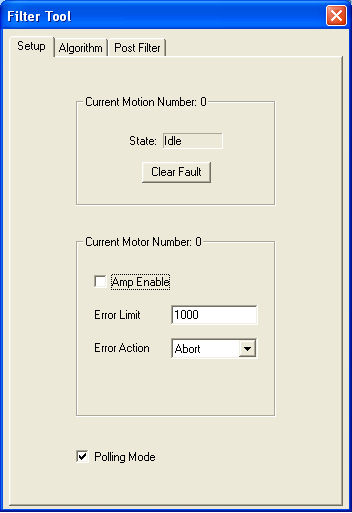 Polling Mode - If this is checked, the Setup tab is continually checking the status of all the values on the Setup tab. If an error is returned from the controller or communication with the controller is broken, this box becomes unchecked and the values are no longer updated. You can recheck this box if you remove the cause of the problem.