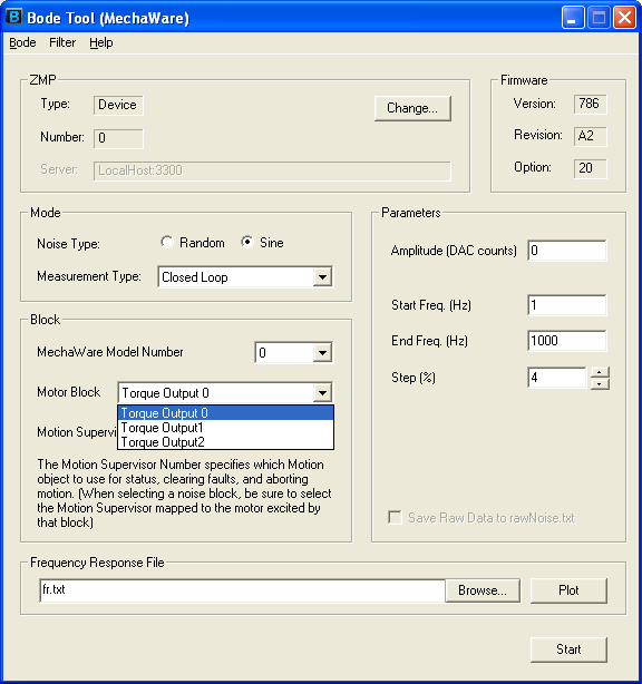 Note: As shown below, if the Bode Tool window indicates Bode Tool, this is for Standard Firmware. If the Bode Tool window indicates Bode Tool (MechaWare), this is for MechaWare Firmware. For more information about viewing and changing filter parameters for Standard Firmware, see Filter Tool - Standard FirmWare.