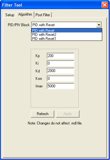 For controllers running MechaWare firmware, all PID and PIV Blocks in the model are accessed from the Algorithm tab. Both the Algorithm and Post Filter tabs include a drop down selection to specify the block name and automatically list the appropriate values to view and/or edit. The block lists are populated from only the currently selected model (as specified on the main dialog).