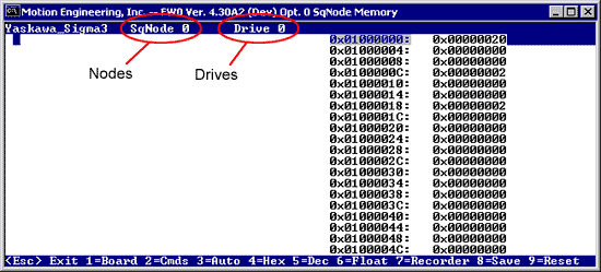 at the command prompt. To navigate within a node's memory space, enter the desired address into the address field. Use the ctrl+pgUp and ctrl+pgDn buttons to access the different nodes on the network. NOTE: Some drives also allow you to access the Drive Memory space. Use the pgUp/pgDn buttons to scroll through the available drives when applicable.