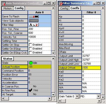 2. With the PID tuning parameters set to zero, add some offset (Motion Console Filter Summary Coeffs tab Output Offset) until you see some stage motion (Motion Console Axis Summary Status tab ). Be sure to do this in both directions by setting a positive and negative offset. Look for a positive motion on a positive offset and a negative motion on a negative offset.