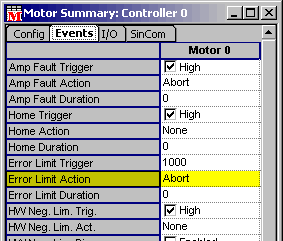 • Set the Amp Fault Action to ABORT. If you get an Amp Fault Event, you want to stop attempting to servo and disable the amp. In all likelyhood, the amp has disabled itself at this point, and further commanded motion has little meaning. If you do not abort the motor (turning the drive off), you will be trying to servo with an axis that isn't servoing correctly in the first place.