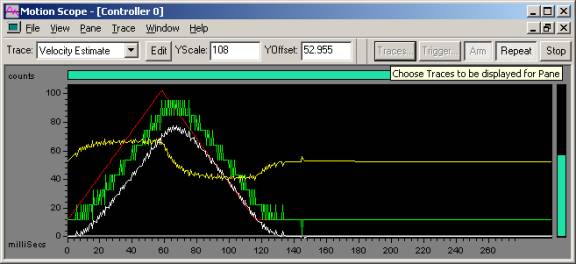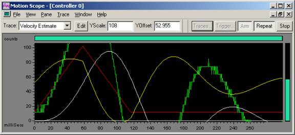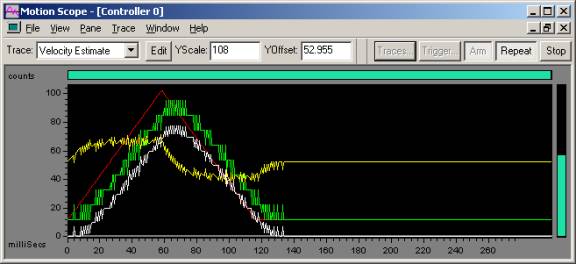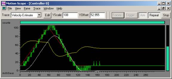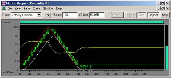 We can see a small amount of smoothing on the velocity estimate (white) as compared to the actual velocty (green). It is easier to see the difference on the velocity error (DAC). In addition, there was a dramatic decrease in audible noise. As there is no noise to speak of on the commanded velocity, all the noise reduction comes from the velocity estimate. Let's try increasing Ka1 to 0.6: