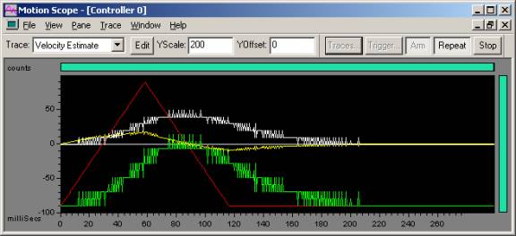 velocity? While we are looking at the actual velocity, let's adjust the velocity estimate scaling. The velocity estimate register we are looking at is actually the velocity estimate (counts/sample) * 10. Adjust the Yscale and Yoffset for the velocity estimate until it covers the actual velocity. This will help show the effects of the low pass section we will apply next.